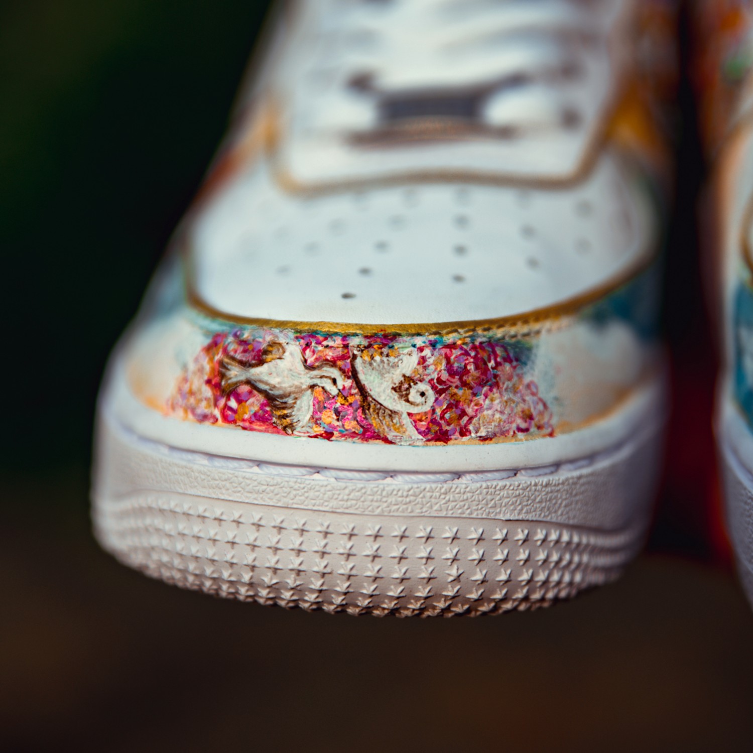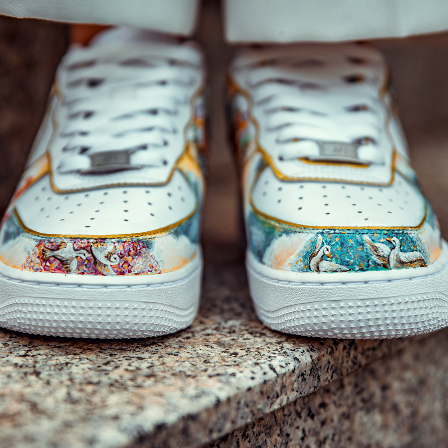 A Celestial kollekció a reneszánsz angyali motívumait ötvözi modern streetwear stílussal. Minden egyes sneaker egyedileg, kézzel készül, kékes felhős hátterével és fényűző aranyozott elemekkel, amelyek a klasszikus reneszánsz festmények hangulatát idézik meg.